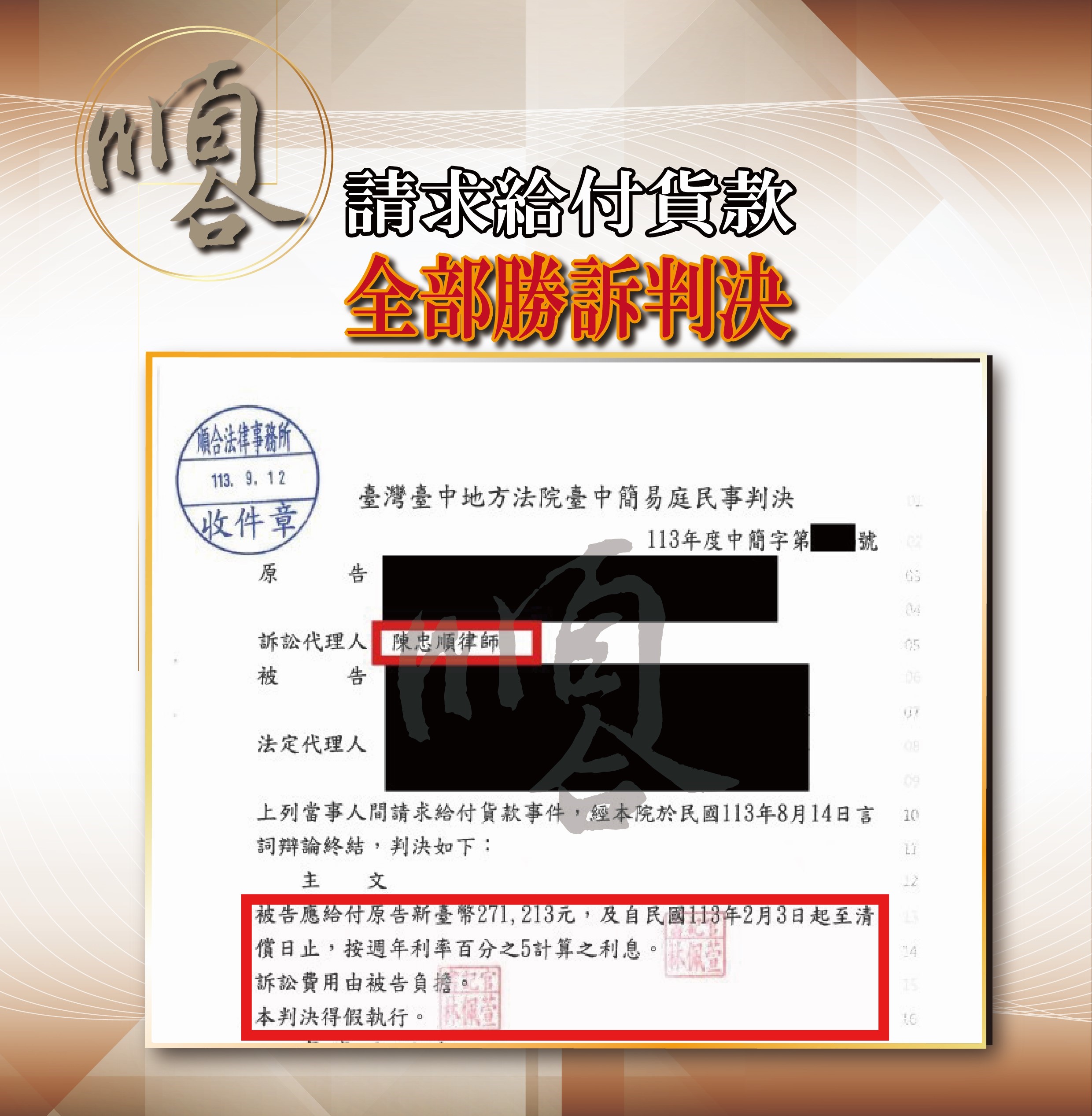 經當事人委任本所陳忠順律師,透過律師提出採購單、出貨單、應收帳款簡要表、統一發票、應收帳款明細表等證據,向法院聲請對被告核發支付命令,並經法院准予核發。