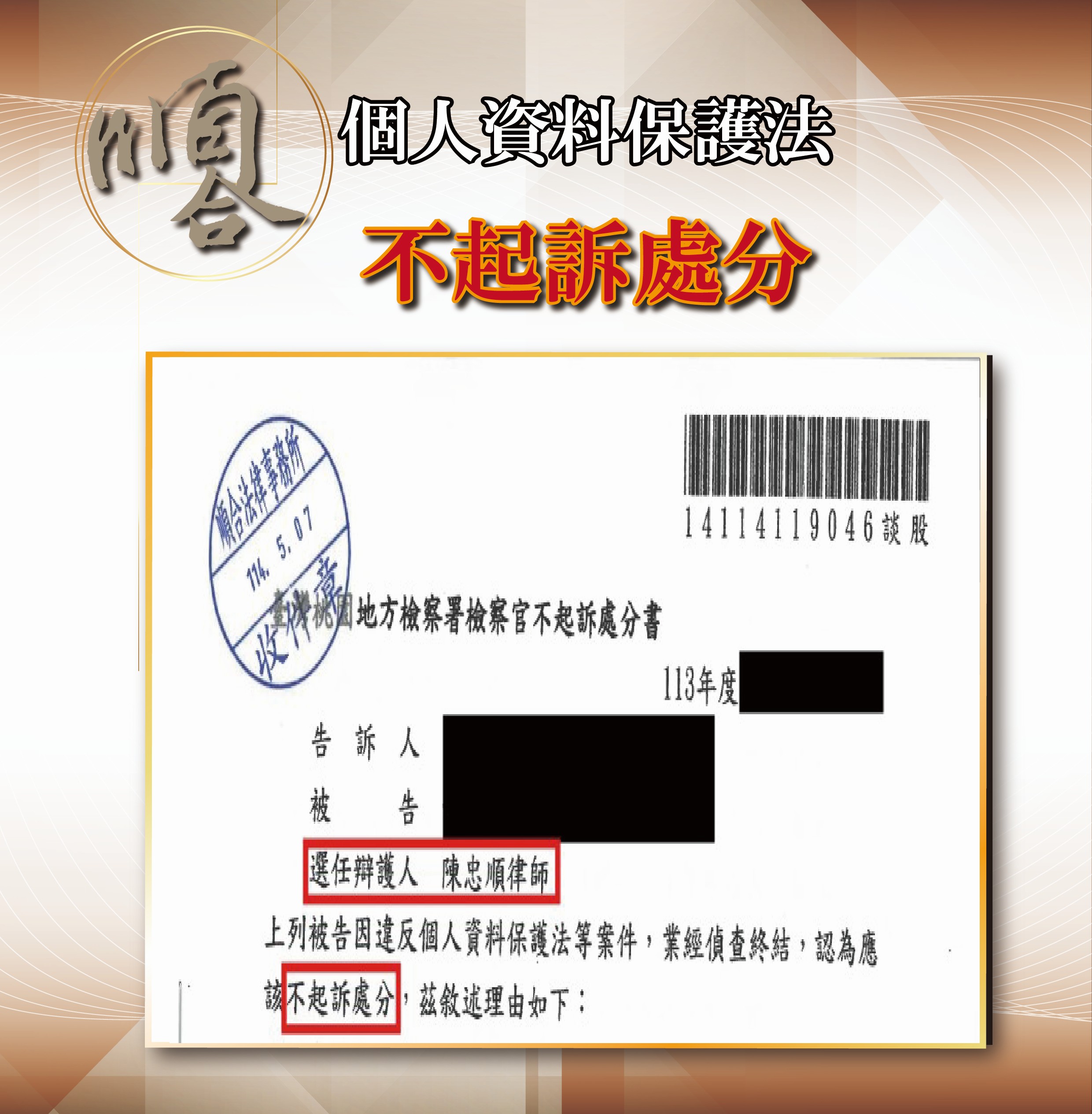 當事人委任本所陳忠順律師,經律師擬定訴訟策略及答辯方向,並提出相關事證,證明雙方確實存有股票買賣之糾紛,使檢察官相信本所當事人意在提醒他人,避免他人遭受相同遭遇,主觀上並無毀損告訴人名譽及違反個人資料保護法之犯意,成功為不起訴處分。