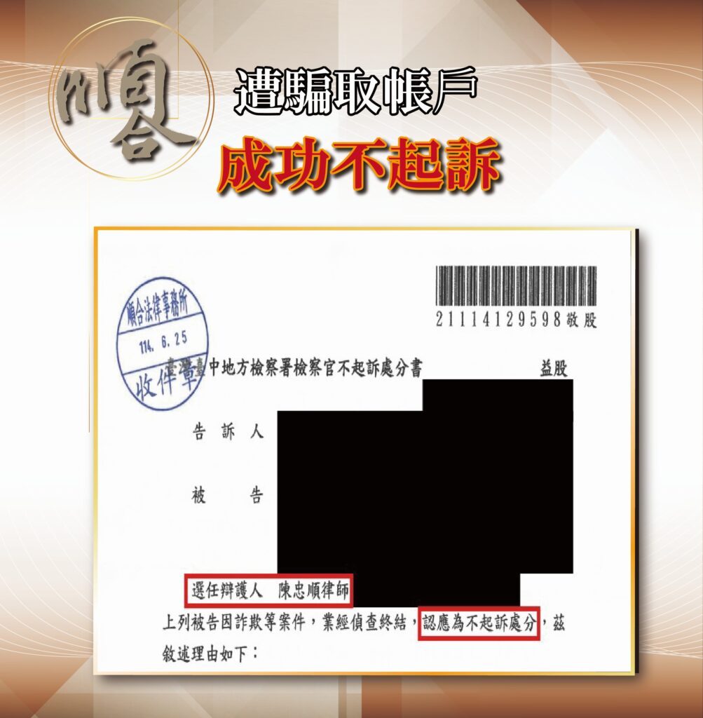 誤信詐騙集團之話術,淪為詐欺幫助犯,成功使檢察官為不起訴處分