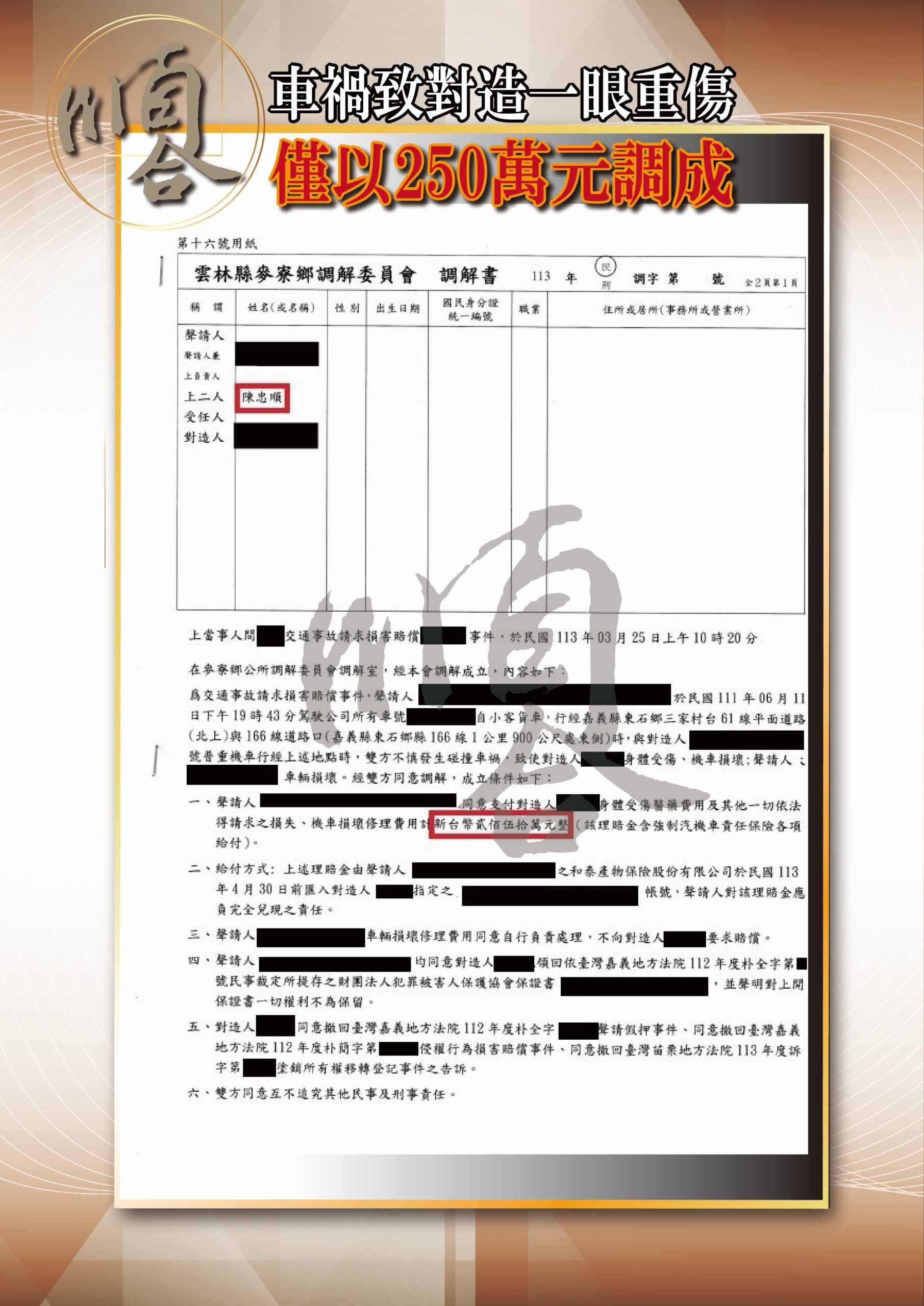 當事人因車禍遭對造求償新臺幣5,397,777元 2024-08-28 當事人因車禍遭求償新臺幣5,397,777元►僅以250萬元調解成立,並由保險公司全額負擔。 當事人因過失致重 當事人因車禍遭對造求償新臺幣5,397,777元 閱讀全文 »