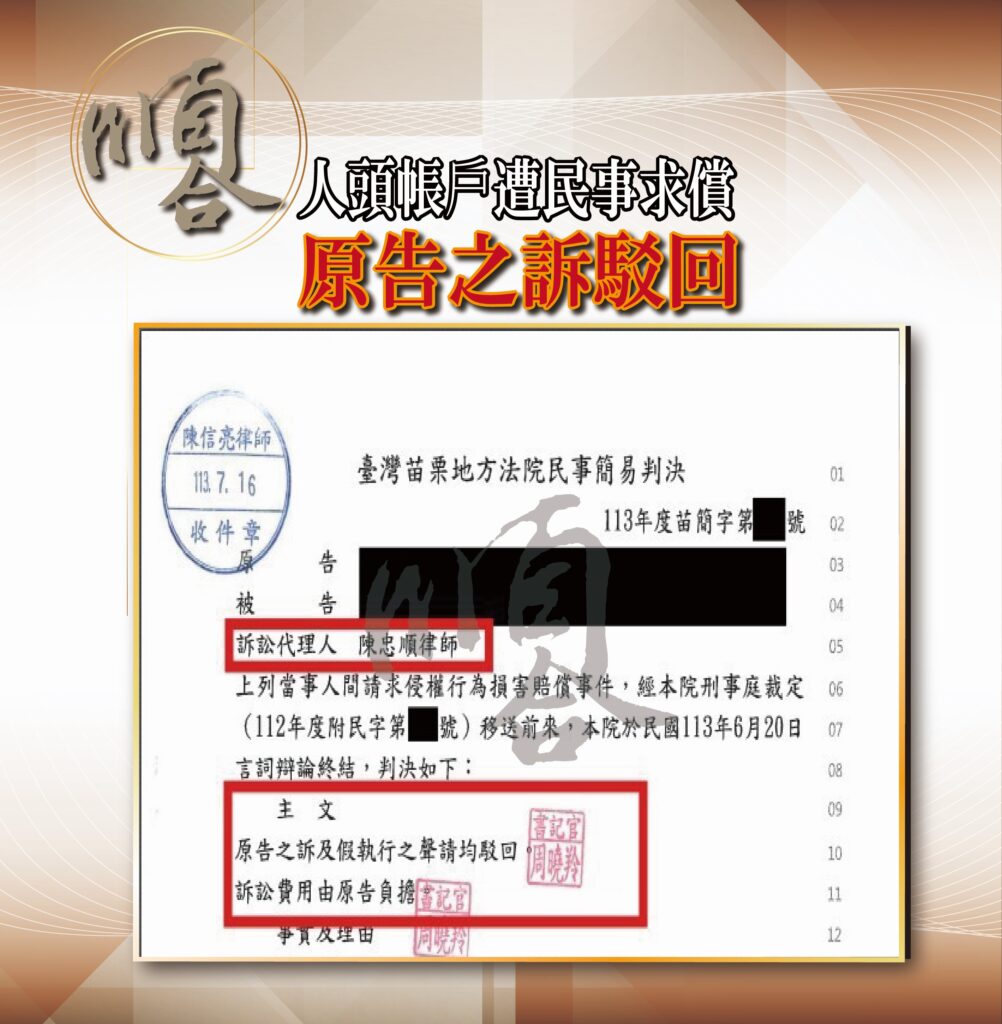 詐騙集團騙取帳戶,成為人頭帳戶,遭民事求償 2024-08-30 被詐騙集團騙取帳戶,遭民事求償►成功使法院判決原告之訴駁回-免賠償 當事人因有貸款需求,希望藉由貸款清償債務, […] 詐騙集團騙取帳戶,成為人頭帳戶,遭民事求償 閱讀全文 »