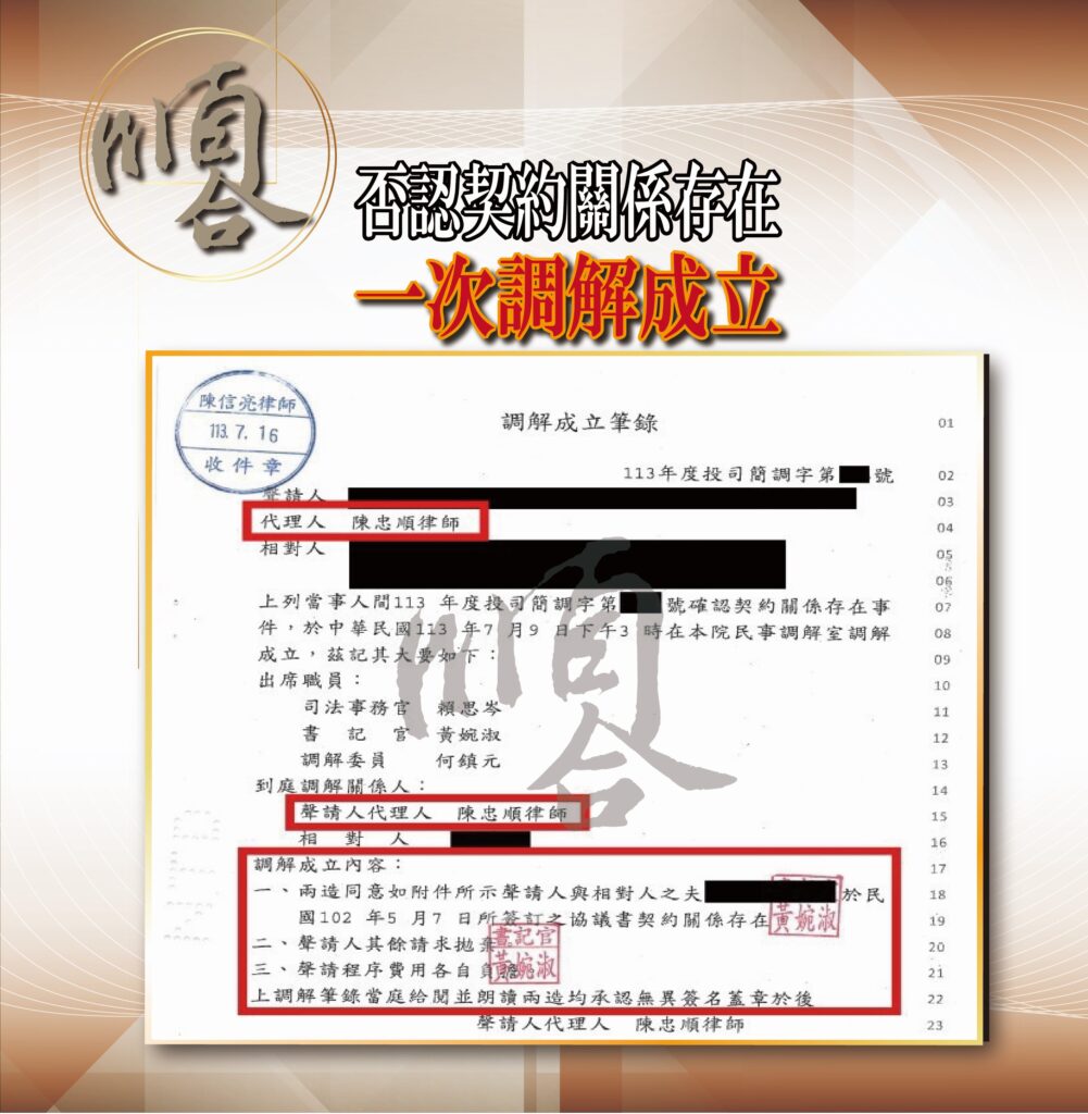 對造否認配偶生前簽立之契約 ►僅經一次調解程序,雙方調解成立 對造之配偶生前曾因繼承土地利益分配之方式與本所當